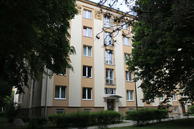 Bytová jednotka se skládá ze dvou pokojů, kuchyně, koupelny, WC, spíže a předsíně. K bytové jednotce patří sklepní kóje k užívání v suterénu objektu, který není započítán do podlahové plochy bytové jednotky. Okna plastová včetně atriového v jednom z pokojů, dveře do koupelny, WC spíže dřevěné rámové do ocelové zárubně původní a do pokojů a kuchyně ze dvou třetin prosklené do ocelových zárubní, vstupní dveře hladké do ocelové zárubně. Podlaha v kuchyni PVC, v předsíni koberec a v koupelně, WC a spíži původní dlažba. V předsíni umístěna šatní souprava (šatník, věšák, botník a zrcadlo). V koupelně vana a místo umyvadla dřez s ker. obklady stěn 1600 mm. WC samostatné s mísou a nádržkou umístěnou v technickém prostoru, stěny polepeny tapetou(siporex příčky). V kuchyni původní kuchyňská linka s nerez dřezem a plynovým sporákem.