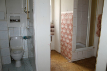 Bytová jednotka se skládá z pokoje, WC, koupelny a předsíně - dle vymezení jednotek. Skutečný stav - pokoj, WC a předsíň neoddělená od koupelny se sprchou, dřezem a plynovým sporákem. Okno pokoje dřevěné špaletové, okno koupelny s kuchyňkou plastové. Dveře na WC hladké do ocelové zárubně, dveře do pokoje a vstupní dveře hladké do ocelové zárubně z interiéru polstrované koženkou. Podlahy v předsíni s koupelnou a kuchyňkou PVC , v pokoji linoleum, na WC dlažba. Koupelna s kuchyňkou vybavena sprchou, dřezem a plynovým sporákem s obkladem stěn keramickým a nalepeným PVC a plastovým sklem. WC samostatné s mísou kombi s nižším obkladem stěn a je zde umístěná karma. Vytápění WAW a ohřev vody karmou. Vedení rozvodu plynu v pokoji po povrchu stěn.