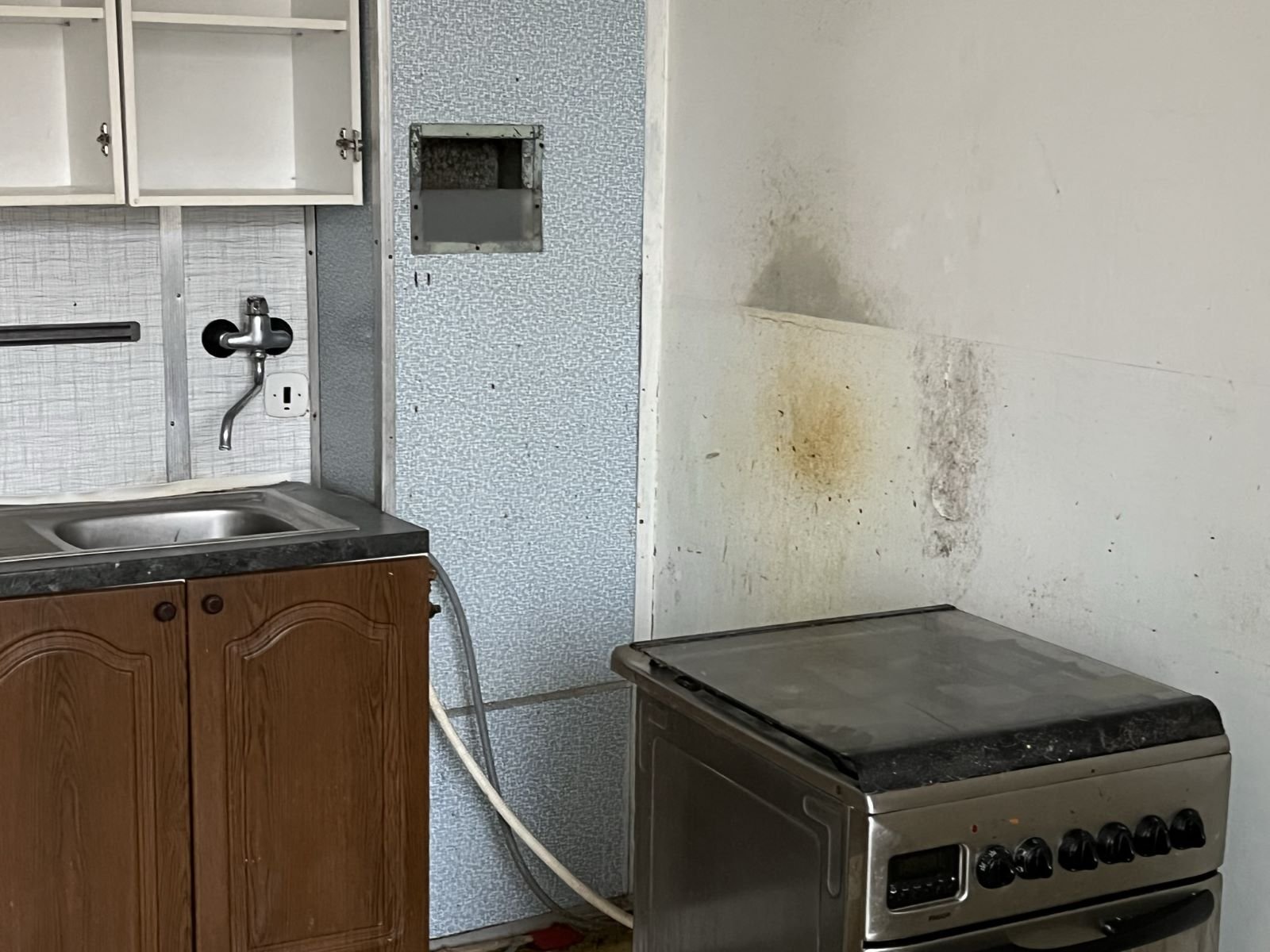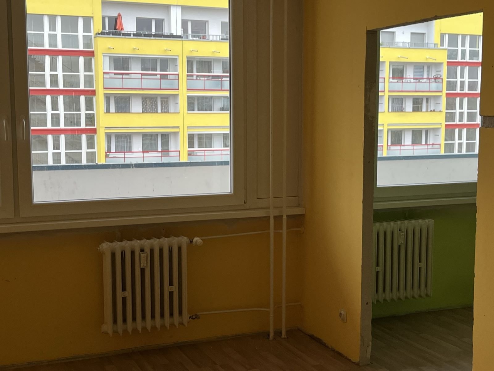 Bytová jednotka se nachází v desátém nadzemním podlaží dvanáctipodlažního panelového zatepleného domu s dvěma výtahy. Bytová jednotka sestává ze tří pokojů, kuchyně, předsíně, spíže, komory, WC a průchozí koupelny (kuchyň a předsíň) a dvou lodžií (ze společných částí domu k výhradnímu užívání. K bytové jednotce patří sklep. Okna plastová. Dveře do pokoje a komory chybí, dveře do kuchyně z pokoje dvoukřídlé do ocelové zárubně ze dvou třetin prosklené, dveře do pokoje hladké ze dvou třetin prosklené, mezi pokoji proříznutý otvor bez zárubně, dveře do spíže hladké s proraženým otvorem, dveře do koupelny a na WC umakartové. Vstupní dveře hladké do ocelové zárubně. Dveře plastové francouzské do lodžií. Podlaha v předsíni, spíži, komoře, koupelně, WC a kuchyni lino. Podlaha lodžie z dlažby. Hygienické zázemí prefabrikovaným umakartovým jádrem - koupelna vybavena vanou a umyvadlem částečně vanou, WC vybaveno WC mísou kombi a chybí dvířka od technického prostoru. Kuchyň vybavena linkou bez dvířek a plynový sporák bez digestoře. Vytápění ústřední.