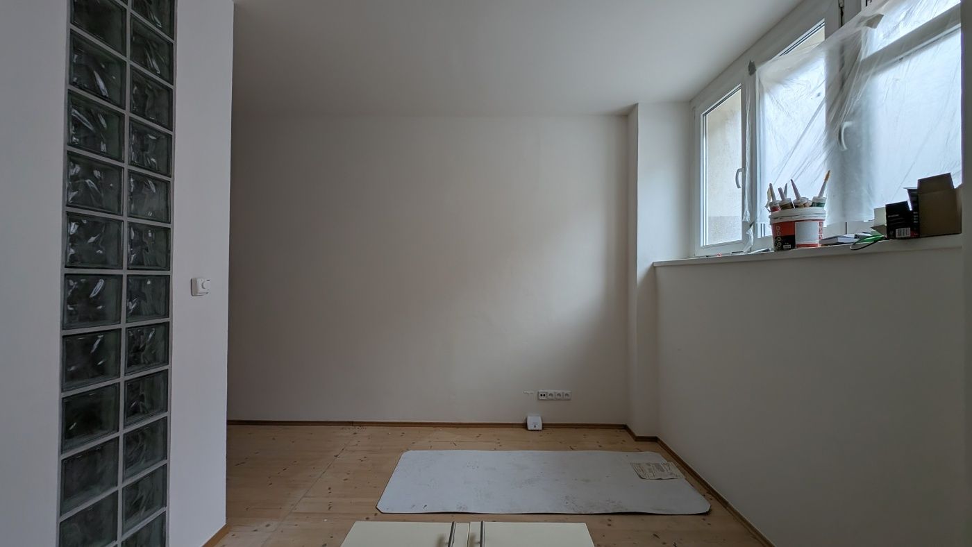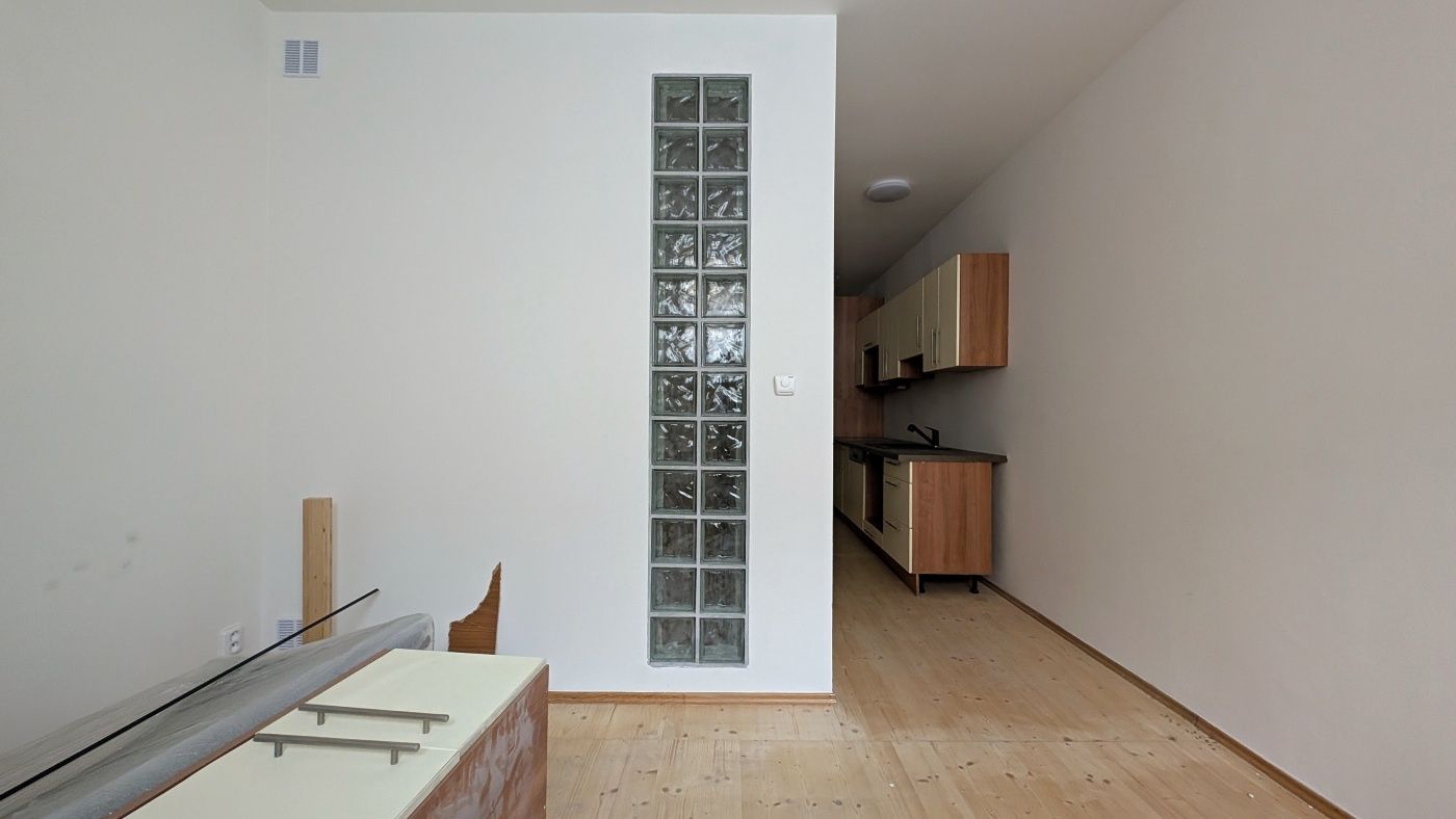 Prostor s členitou dispozicí zahrnující dvě hlavní místnosti a dvě koupelny. V interiéru jsou položeny dřevěné podlahy. Výrazným prvkem je vnitřní stěna z luxferových tvárnic, která propouští světlo z chodby budovy. Koupelny jsou vybaveny sanitou (vana, sprcha) a moderním obkladem. Okna směřují do světlíku či anglického dvorku.